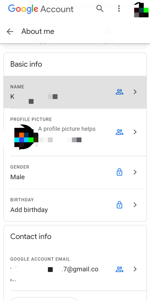 ◾നിങ്ങളുടെ Google അക്കൗണ്ട് ക്രമീകരണങ്ങൾ തുറക്കുക. ചുവടെ കാണുന്ന ചിത്രത്തിൽ (ചിത്രം1) ഉള്ളപോലെ ഒര് പേജ് ലഭ്യമാകും. ഇവിടെ നിങ്ങൾ ഗൂഗിളിന് നൽകിയ വിവരങ്ങൾ കാണാനും എഡിറ്റ് ചെയ്യാനും സാധിക്കും.
